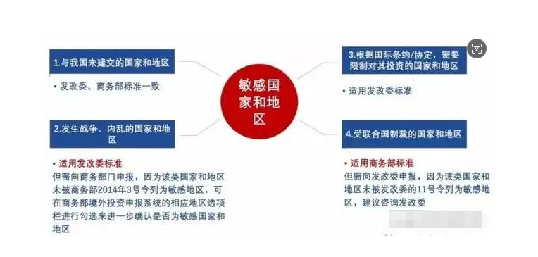 需要注意的是:ODI根據(jù)投資金額大小、行業(yè)、國家等因素,分為備案制和核準(zhǔn)制。如果是涉及敏感行業(yè),無論項目投資金額大小,一律提交商務(wù)部和發(fā)改委進(jìn)行核準(zhǔn)。關(guān)于敏感地區(qū)和敏感行業(yè)的界定,詳見下圖: